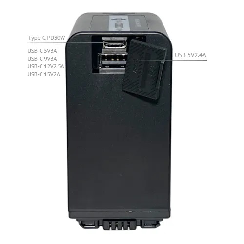 Він також може використовуватися як Power bank для заряджання широкого спектра пристроїв із функцією швидкого заряджання PD 30W через роз'єми USB Type-C і USB Type-A (телефони, ноутбуки, планшети тощо).