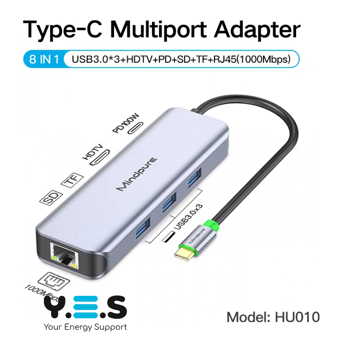 Адаптер Mindpure HU010 8-в-1 USB‑C: 3×USB 3.0, HDMI, PD, SD/TF, Gigabit RJ45