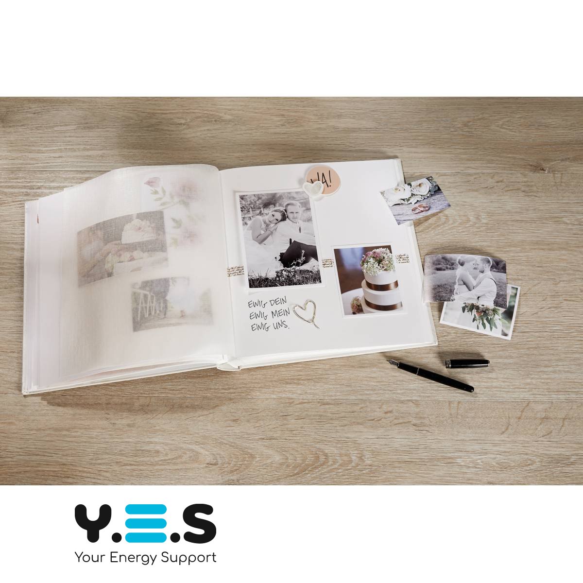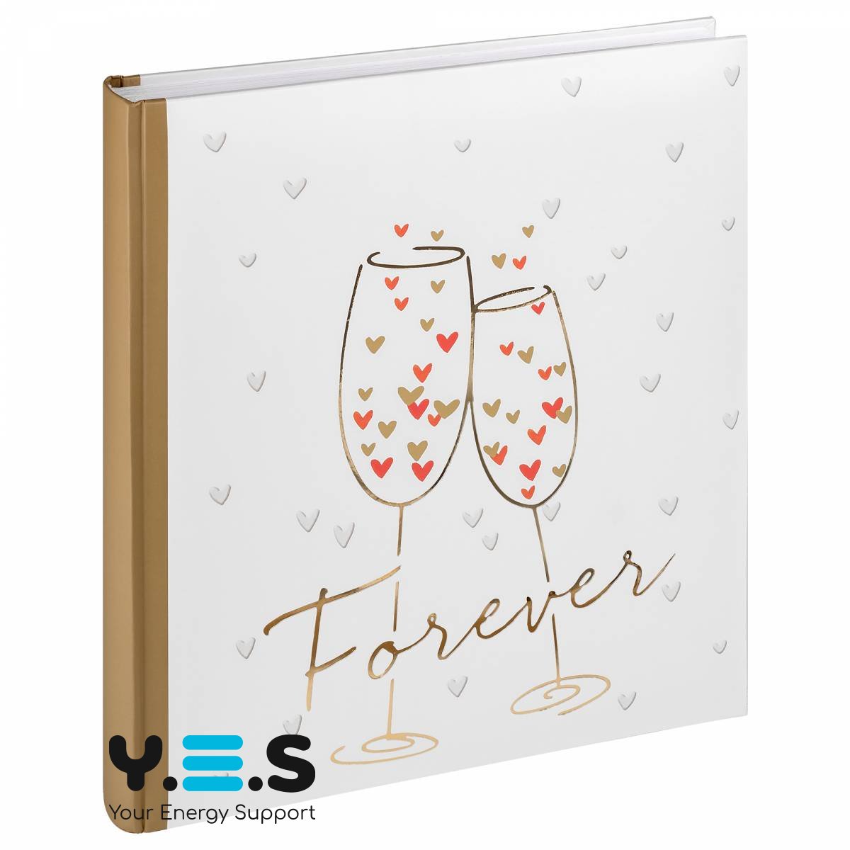 Весільний альбом в книжковій палітурці з тисненим написом із золотої фольги "Forever", з високоякісною обкладинкою з ламінованим художнім принтом. Альбом у форматі 28x30,5 см містить 50 білих сторінок, виконаних з безкислотного фотокартону, з білими пергаміновими захисними сторінками.