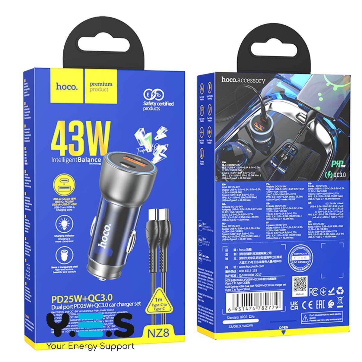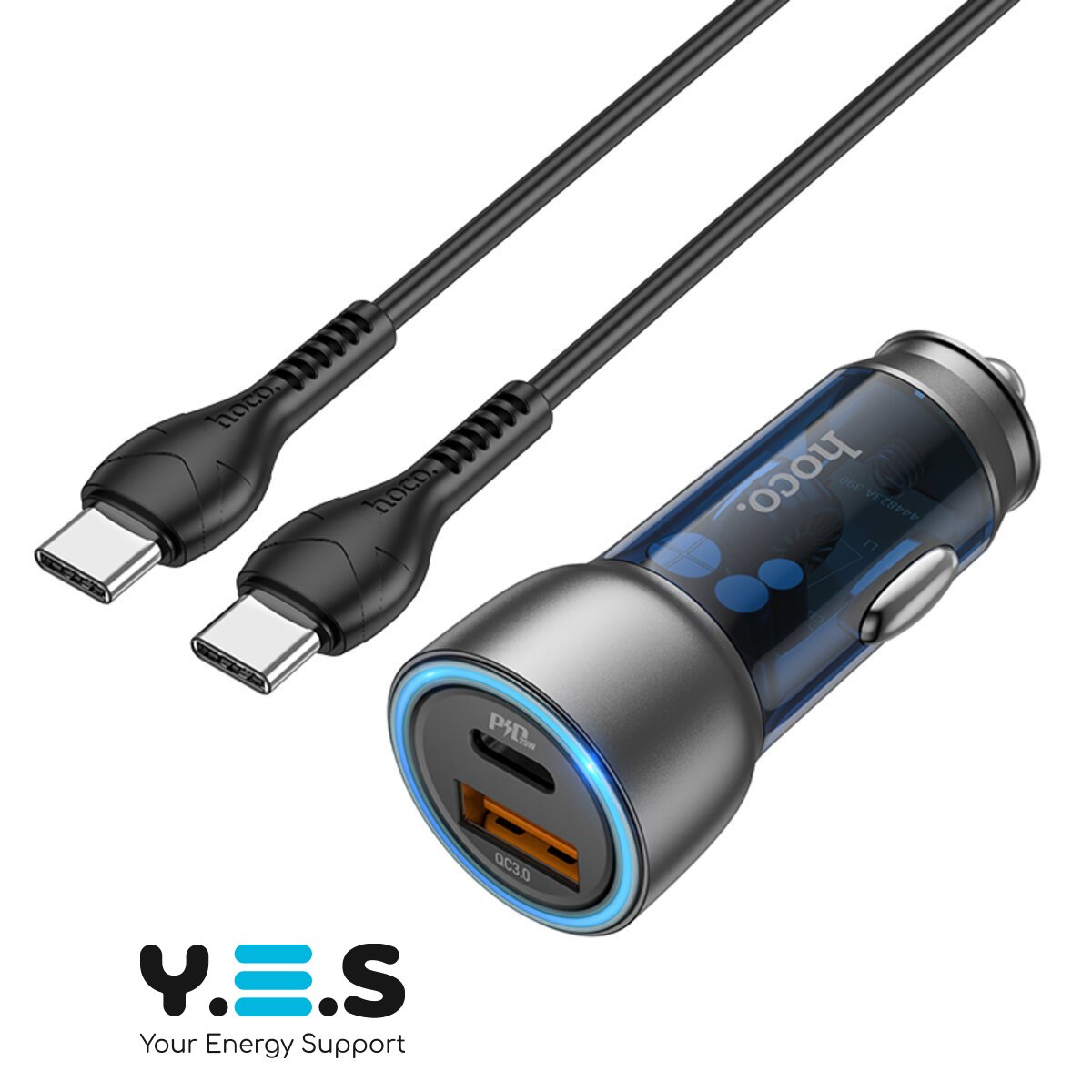HOCO NZ8 Sprinter 43W dual port PD25W+QC3.0 car charger set(Type-C to Type-C) — автомобільний зарядний пристрій з підтримкою швидкої зарядки, оснащений 2 роз'ємами та кабелем Type-C — Type-C в комплекті. УНІВЕРСАЛЬНИЙ У ВИКОРИСТАННІ Зарядний пристрій може використовуватися в будь-якій машині: легковій, сімейному мікроавтобусі, вантажівці тощо. Стильний корпус і мініатюрний розмір роблять використання більш зручним і приємним. МОЖЛИВОСТІ ЗАРЯДЖАННЯ Зарядний пристрій оснащений роз'ємами Type-C і USB, що підтримують протоколи швидкої зарядки. З ним ви зможете заряджати до 2 гаджетів одночасно із загальною потужністю 40-43W. LED-ІНДИКАТОР Світловий індикатор показує робочий статус зарядного пристрою і спрощує його пошук, коли в салоні автомобіля темно. ЗАХИСНІ ВЛАСТИВОСТІ Вбудований захист оберігає ваші ґаджети від перегрівання, надструму, стрибків напруги, надлишкового заряджання та короткого замикання. Корпус із вогнетривкого полікарбонату й алюмінієвого сплаву забезпечує захист від зовнішніх ушкоджень і довгий термін служби.
