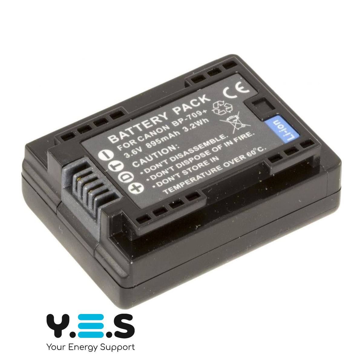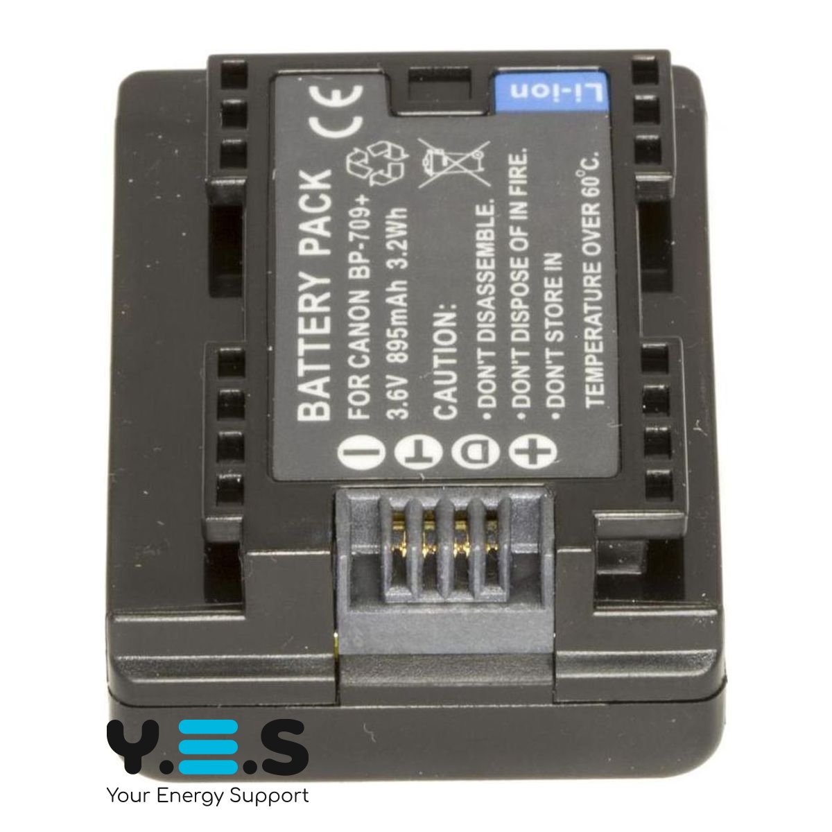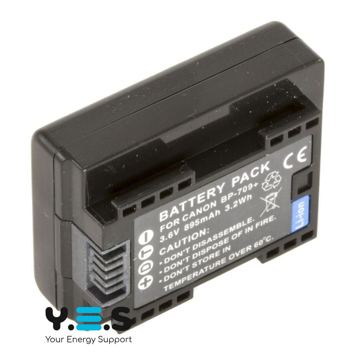 Батарея BP-709, ємністю 895 mAh, 100% сумісна з оригінальним акумулятором CANON BP-709. Батарея містить «інфо-чіп», який дозволяє відображати залишок часу заряду або кількість кадрів на дисплеї камери, і заряджати акумулятор як від оригінального зарядного пристрою CANON CG-700.