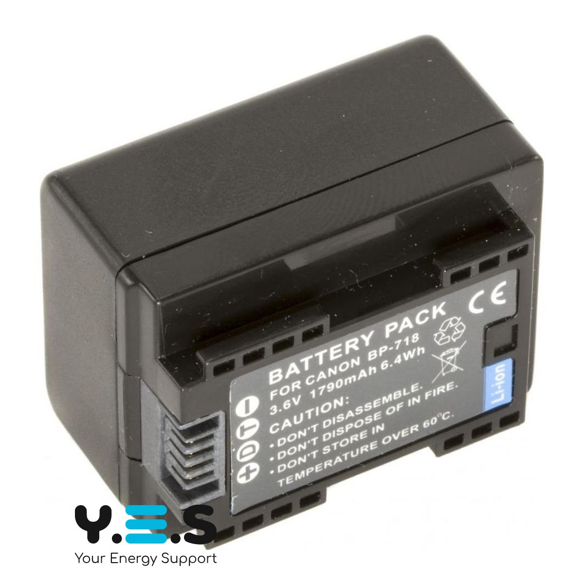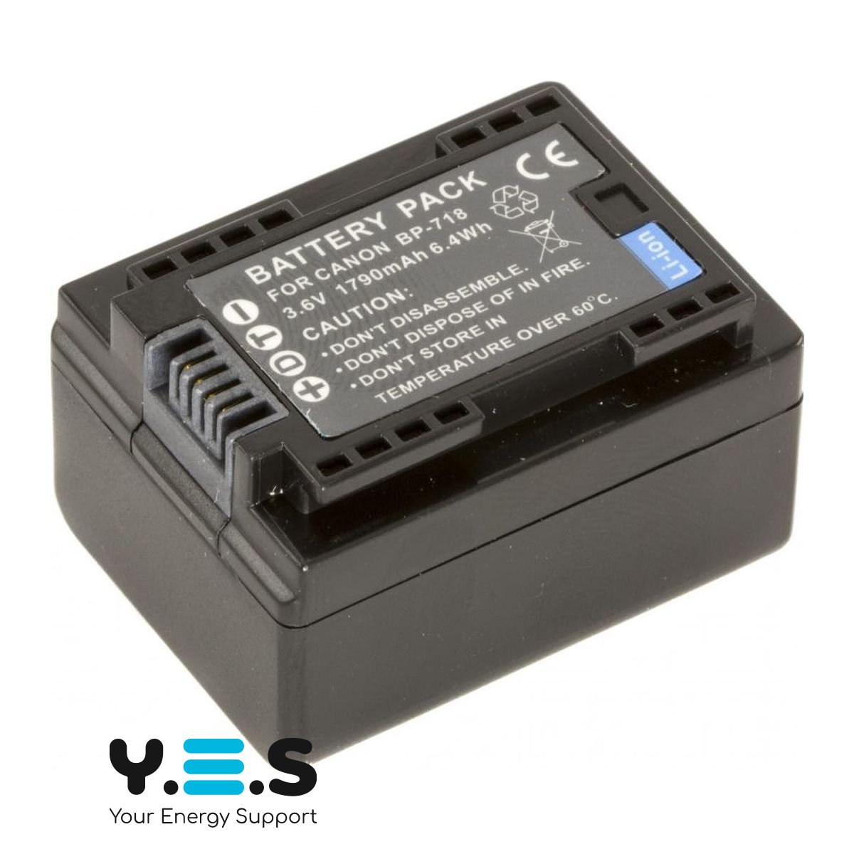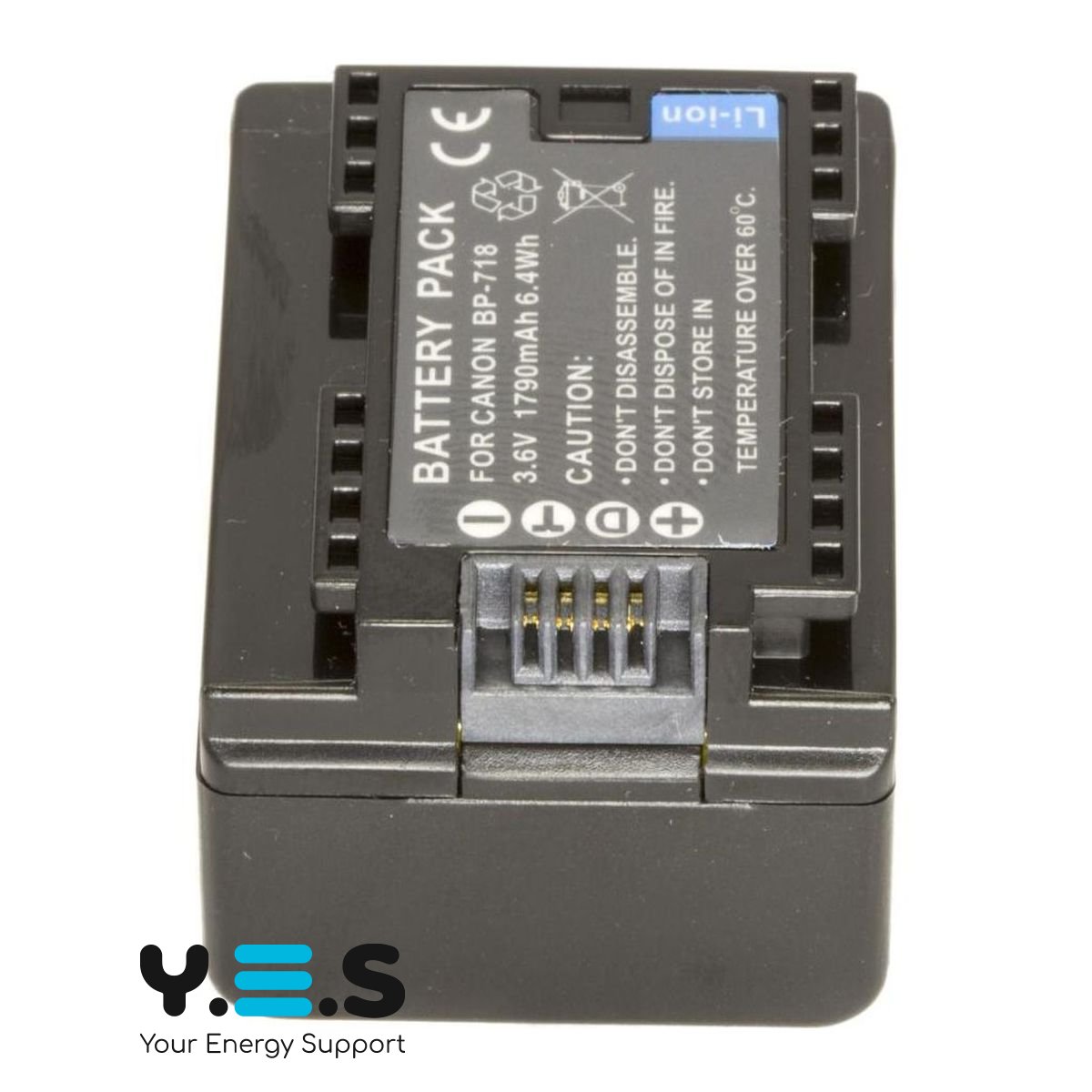Батарея BP-718, ємністю 1790 mAh, 100% сумісна з оригінальним акумулятором CANON BP-718. Батарея містить «інфо-чіп», який дозволяє відображати залишок часу заряду або кількість кадрів на дисплеї камери, і заряджати акумулятор як від оригінального зарядного пристрою CANON CG-700.