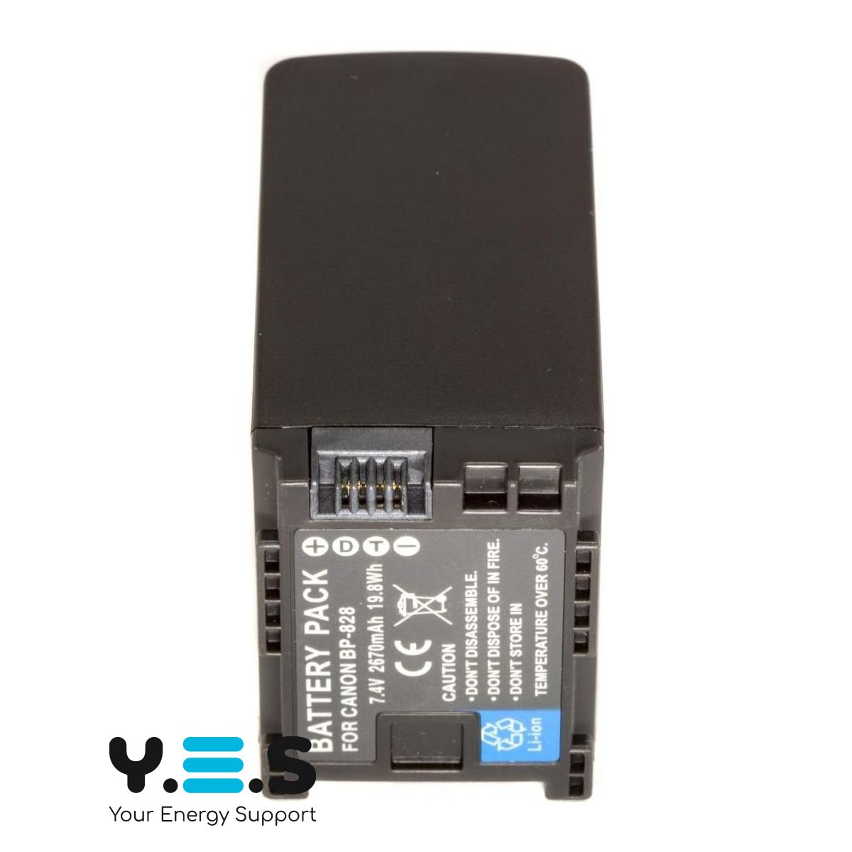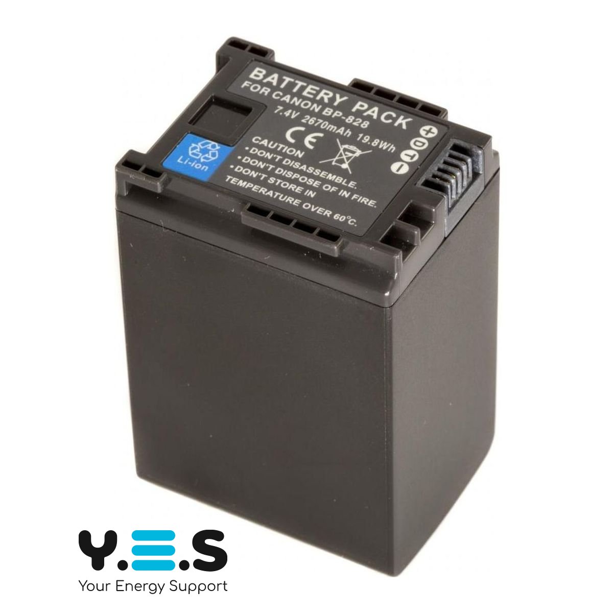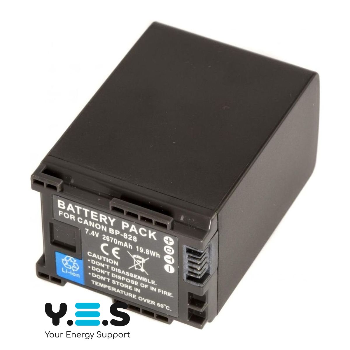 Батарея BP-828, ємністю 2670 mAh, 100% сумісна з оригінальним акумулятором CANON BP-828. Батарея містить «інфо-чіп», який дозволяє відображати час заряду, що залишився, або кількість кадрів на дисплеї камери, і заряджати акумулятор як від оригінального зарядного пристрою.