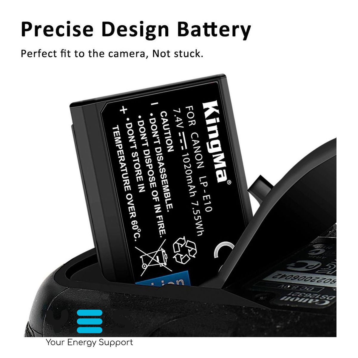 - Сумісність: Canon LP-E10, EOS 1100D, EOS Kiss X50, EOS Rebel T3, EOS Rebel T5, EOS 1200D, EOS 1300D, EOS 2000D, EOS Rebel T6, EOS Rebel T7, EOS Rebel T100, EOS 1500D, EOS 3000D, EOS 4000D, EOS Kiss X80, EOS Kiss X90