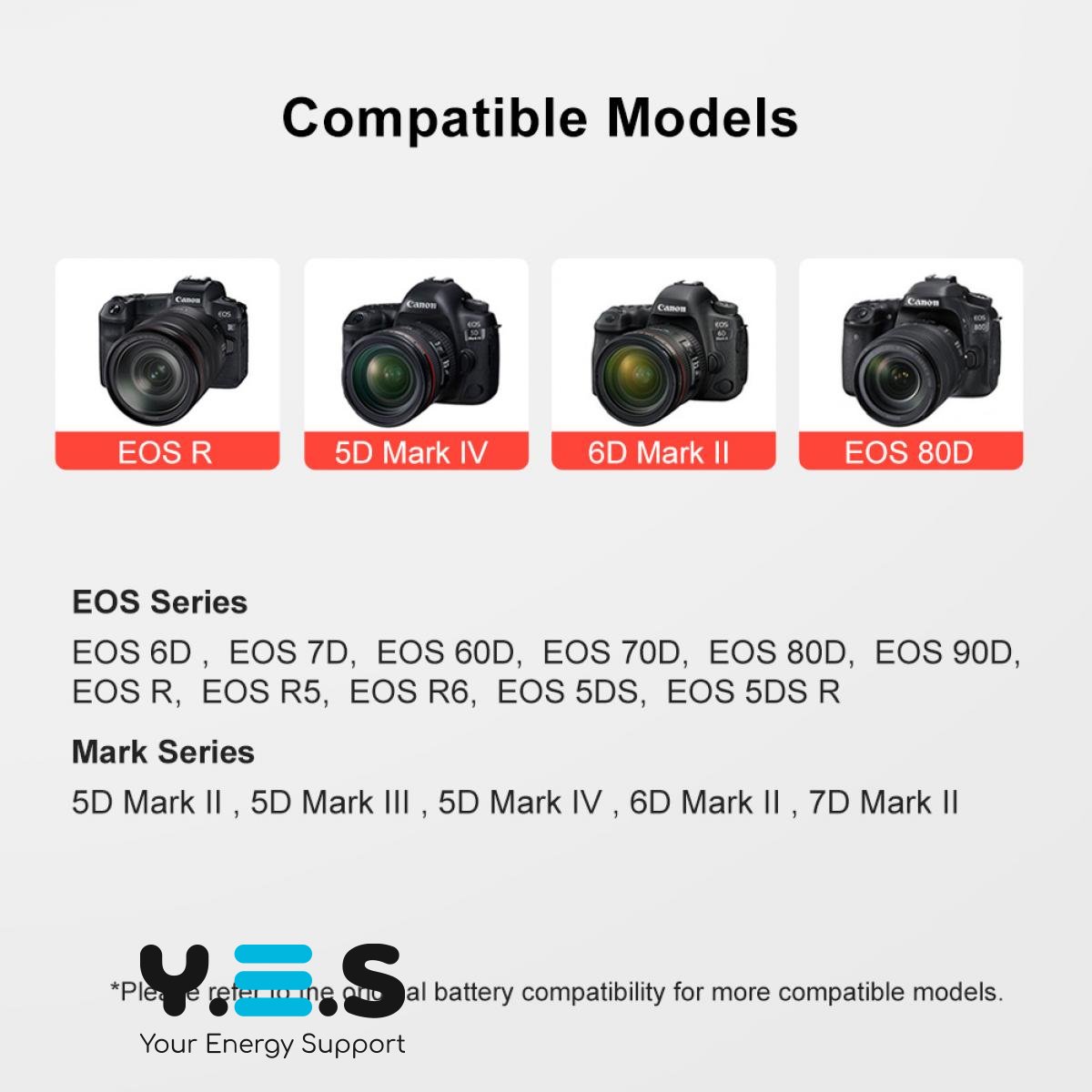 - Сумісність: Canon LP-E6, EOS 5D Mark II, EOS 5D Mark III, EOS 60D, EOS 60Da, EOS 6D, EOS 7D, EOS 70D, EOS 5DS, XC10, EOS 5D Mark 2, EOS 5D Mark 3
