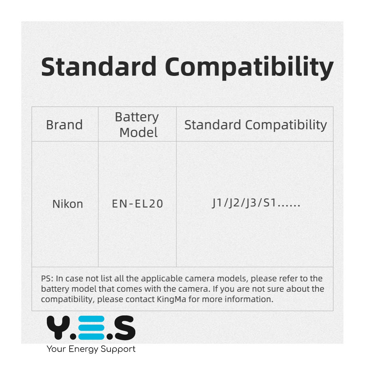 Акумуляторна батарея KingMa EN-EL20 (заміна Nikon EN-EL20) з технологією Smart IC Chip – це акумулятор нового покоління, що забезпечує безпомилкову комунікацію з камерою та на 100% відповідний оригінальному акумулятору по ємності, зносостійкості та функціональності. Підходить для камер Nikon.