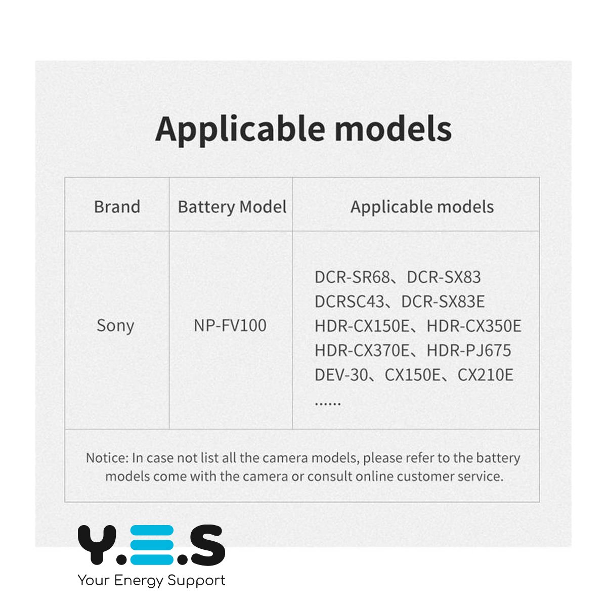 - Сумісність: Sony NP-FV100, DCR-SR58E, DCR-SR78E, HDR-CX500V, HDR-CX520V, HDR-HC9, DCR-PJ5, DCR-SR15, DCR-SR15E, DCR-SR20, DCR-SR20E, DCR-SR21, DCR-SR21E, DCR-SR58, DCR-SR68, DCR-SR68E