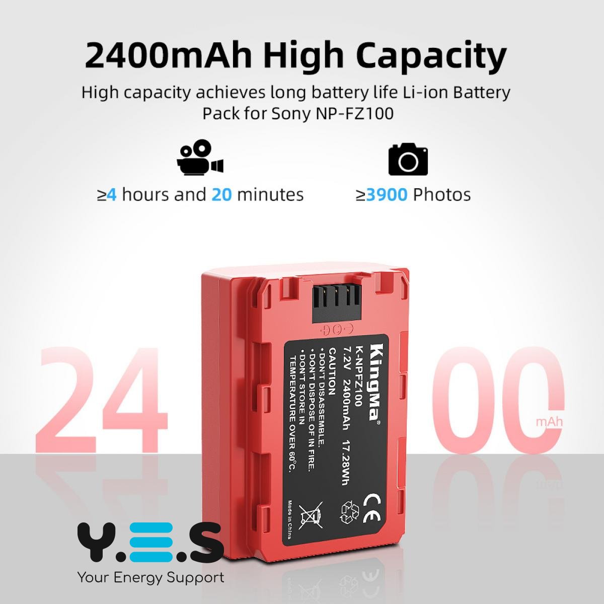 - Чесна ємність: якщо заводська ємність акумулятора KingMa NP-FZ100 дорівнює 2400 mAh, то саме ця ємність і буде заявлено на акумуляторі, ні одиницею більше. Якщо ви знайшли батарею, ємність якої на етикетці значно перевищує оригінальну, то це, напевно, помилкова інформація. Якість складання: акумулятори KingMa проходять ретельний процес контролю якості на кожному етапі виробництва. Кожна батарея тестується на перегрів (overheating), коротке замикання (short circuit), повний розряд (over discharging) і надзаряд (overcharging), перенапруга (overvoltage) і надструми (overcurrent)