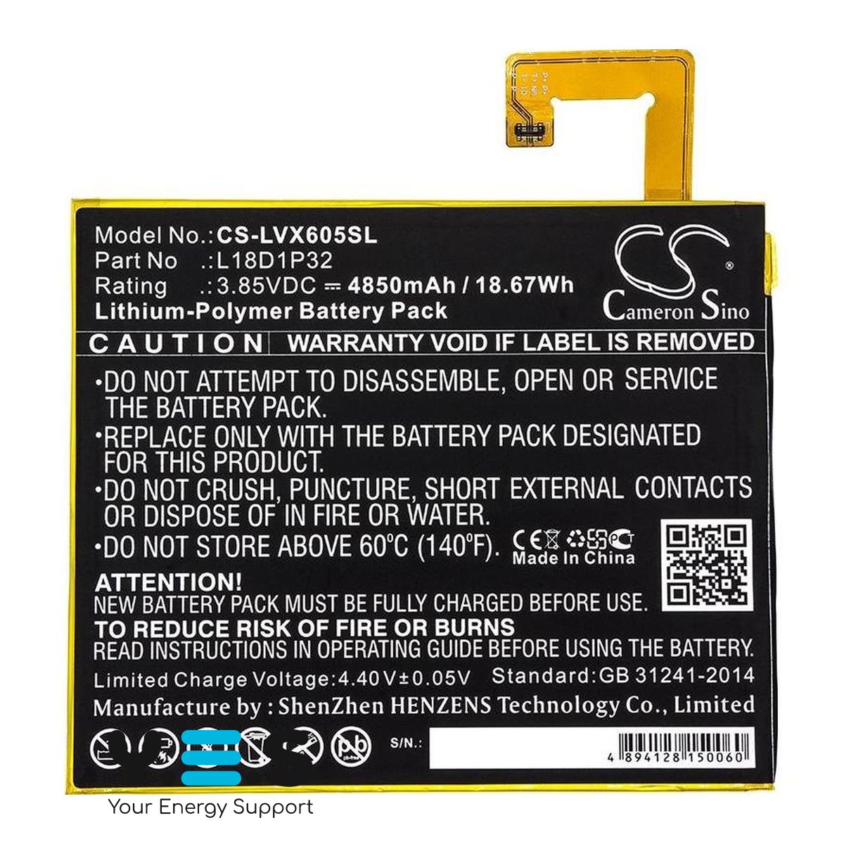 Акумулятор пройшов всі заводські випробування з якості та безпеки і повністю сумісний з оригінальним акумулятором Lenovo L18D1P32 (CS-LVX605SL) Вашого планшета. Щоб переконатися в правильності вибору батареї, порівняйте серійний парт-номер батареї із сумісними парт-номерами цього акумулятора: L18D1P32.