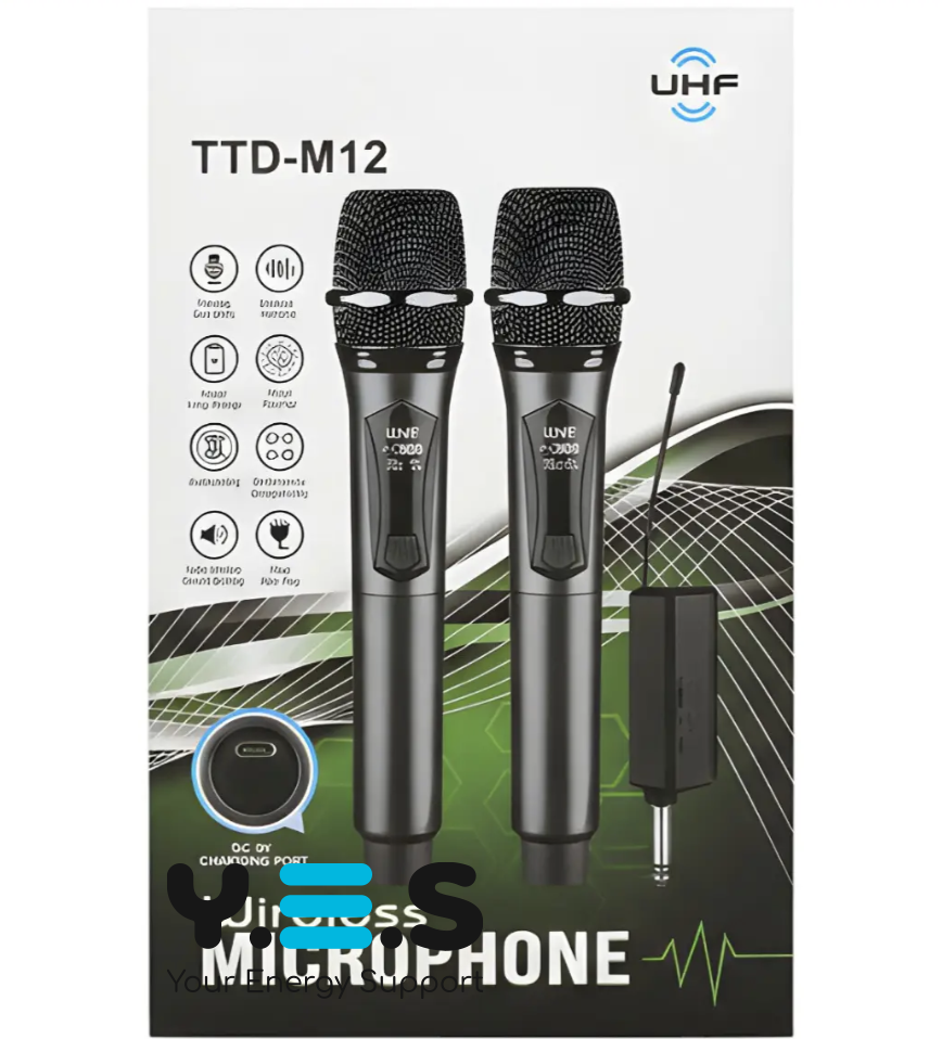 Бездротові мікрофони UHF TTD-M12 — караоке-система на два мікрофони для зручного співу, виступів і домашніх заходів. Модель працює в UHF-діапазоні та забезпечує комфортне використання без зайвих дротів.