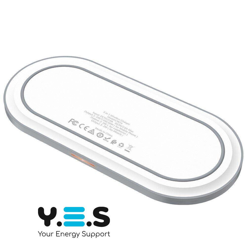 Бездротовий зарядний пристрій Hoco CW24 3 in 1 Wireless Fast Charge забезпечує зарядку смартфона, бездротових навушників та смарт-годиннику без необхідності підключення кабелю безпосередньо до зарядного роз'єму. Аксесуар виключить потребу у використанні відразу кількох зарядних пристроїв та безлічі кабелів для заряджання різних пристроїв, що допоможе заощадити час та місце на своєму робочому просторі. Зарядка працює за стандартом Qi, сумісна з 99% телефонів з підтримкою бездротової зарядки, Apple Watch та бездротових гарнітур.
