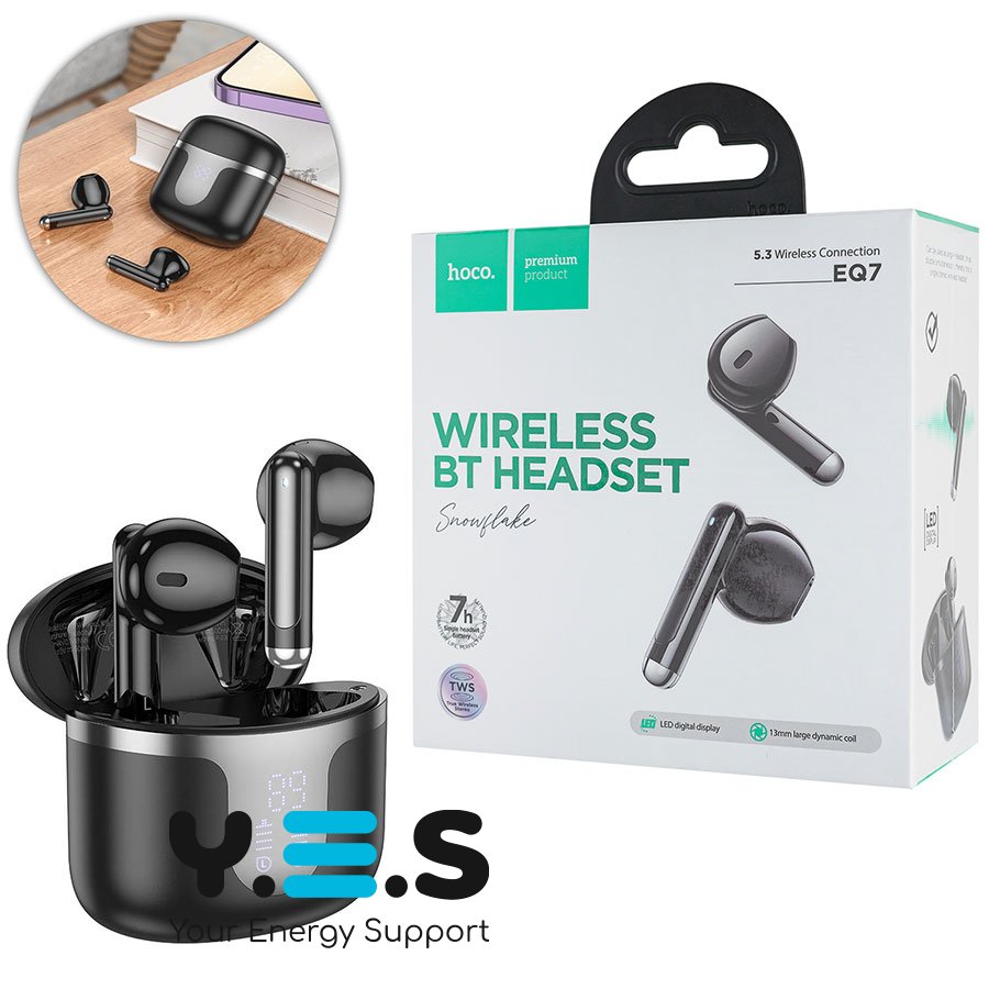 Бездротові навушники HOCO EQ7 Snowflake — компактна та зручна true wireless гарнітура для щоденного використання. Модель у чорному кольорі забезпечує стабільне підключення по Bluetooth і підходить для прослуховування музики та дзвінків у дорозі, вдома чи на роботі. Це якісний і надійний аксесуар на кожен день.