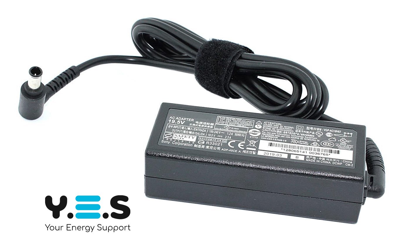 Блок живлення OEM для ноутбуків Sony потужністю 45W. Працює при напрузі 19.5V та силі струму 2.3A. Оснащений стандартним круглим роз'ємом 6.5×4.4мм зі штирьком усередині. Модель VGP-AC19V68 сумісна з великою кількістю ноутбуків Sony VAIO.