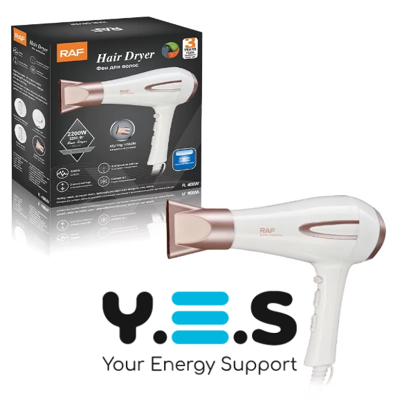 Фен для волосся RAF R.408, 2200 Вт — якісний та надійний прилад для щоденного використання вдома. Потужність 2200 Вт забезпечує швидке сушіння та комфортну укладку, допомагаючи економити час і отримувати охайний результат.