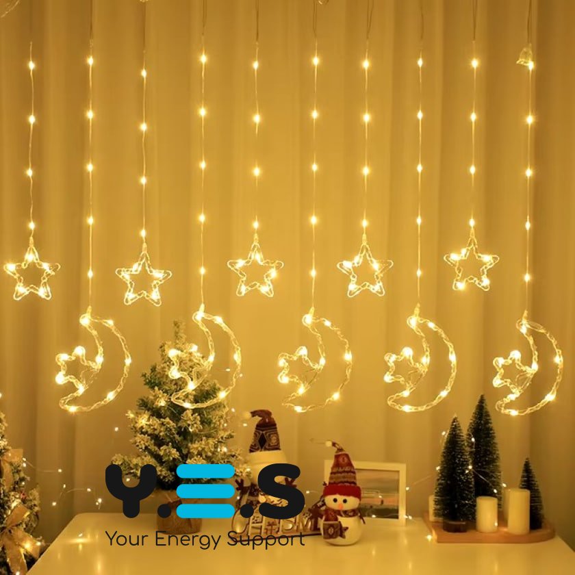Гірлянда-Штора SF-43 «Зірки та місяць» — декоративна світлодіодна штора довжиною 3 м із теплим світлом та живленням від USB. Підійде для оформлення вікна, стіни, фотозони або святкового декору. Якісний і надійний варіант для щоденного використання вдома.