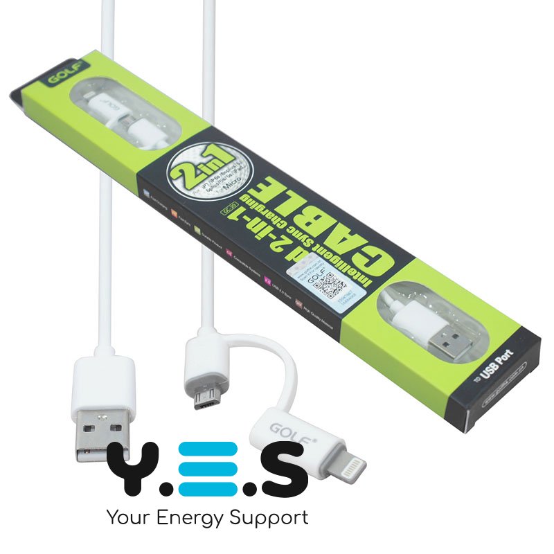 Кабель GOLF GC-20, Lightning and microUSB (2in1) — універсальний кабель 2-в-1 для заряджання та підключення пристроїв із роз’ємами Lightning та microUSB. Практичне рішення для щоденного використання вдома, в офісі або в дорозі. Кабель виконаний якісно та розрахований на надійну щоденну експлуатацію.
