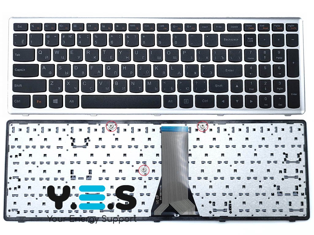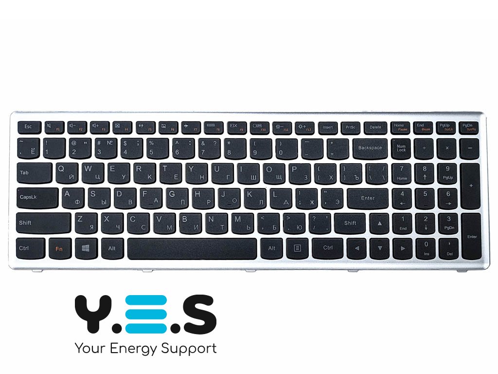 Клавіатура для Lenovo IdeaPad G500s/G505s/S500/S510p/Z510/Flex 15/15D — чорна (RU), з рамкою Silver