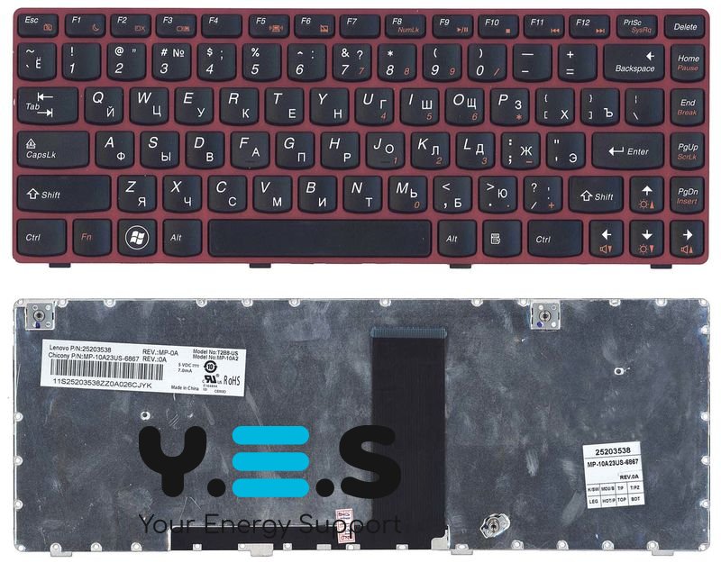 Чорна клавіатура для ноутбуків Lenovo IdeaPad V380, V380A, V380S та V480S / V485 з червоною монтажною рамкою. Підтримує US + RU розкладку (англійська та російська), без підсвітки. Часто подається як "US Russian Keyboard w/ red frame" (наприклад MP‑10A23SU‑6860 або подібні). Ідеально підходить для заміни клавіатури з червоною рамкою.