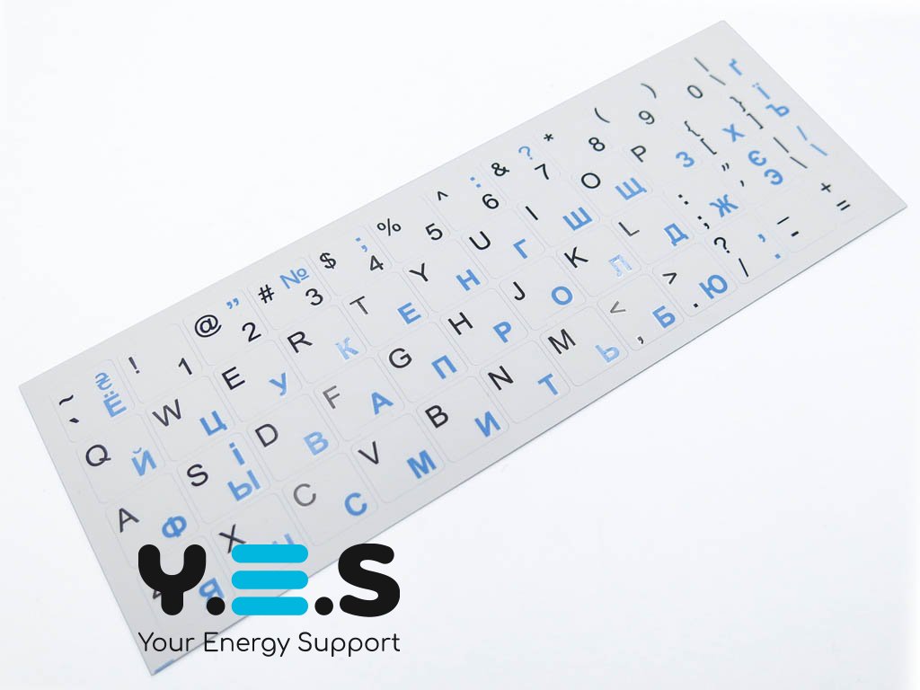 Матові наклейки на клавіатуру ноутбука на білій непрозорій основі — англійська розкладка; українська та кирилиця (блакитні) — із захисним UV-лаком