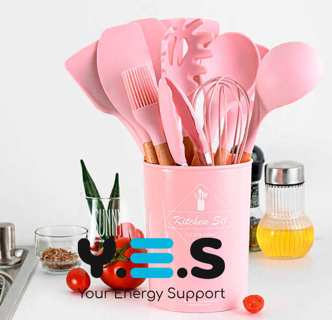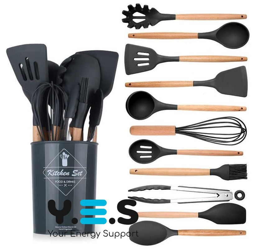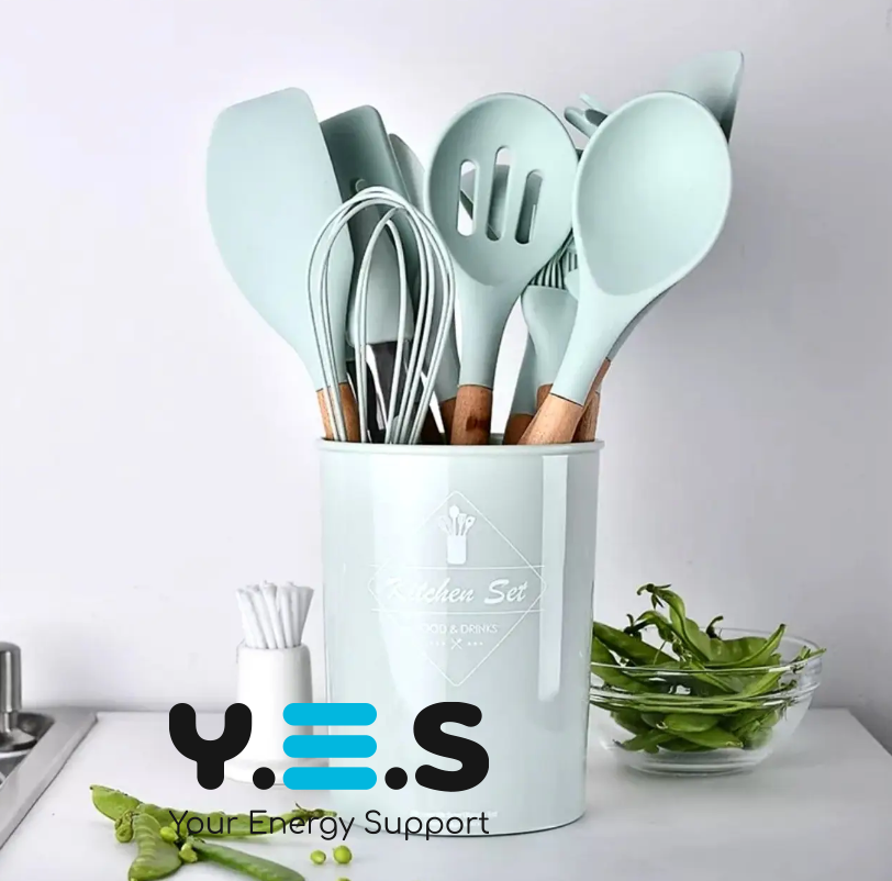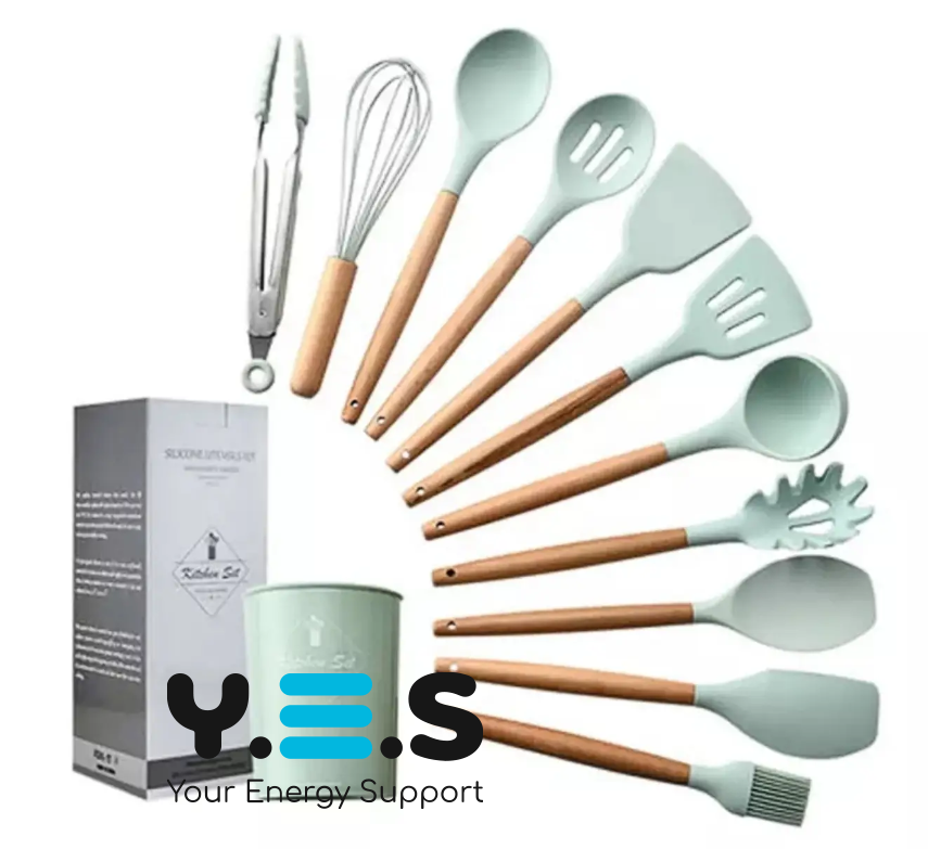 Набір кухонного приладдя Kitchen Set (12 предметів) — практичний комплект силіконових аксесуарів для кухні з підставкою. Підійде для щоденного приготування їжі, допомагає підтримувати порядок на кухні та зручно зберігати інструменти в одному місці.