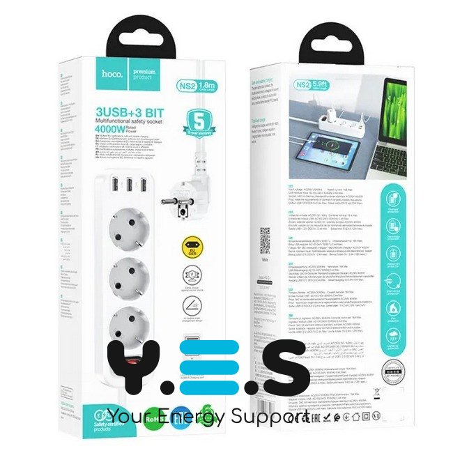 NS2 3-позиційний подовжувач 3 розетки 3 USB 1.8м (3*USB-виходи) (ЄС/Німеччина) white