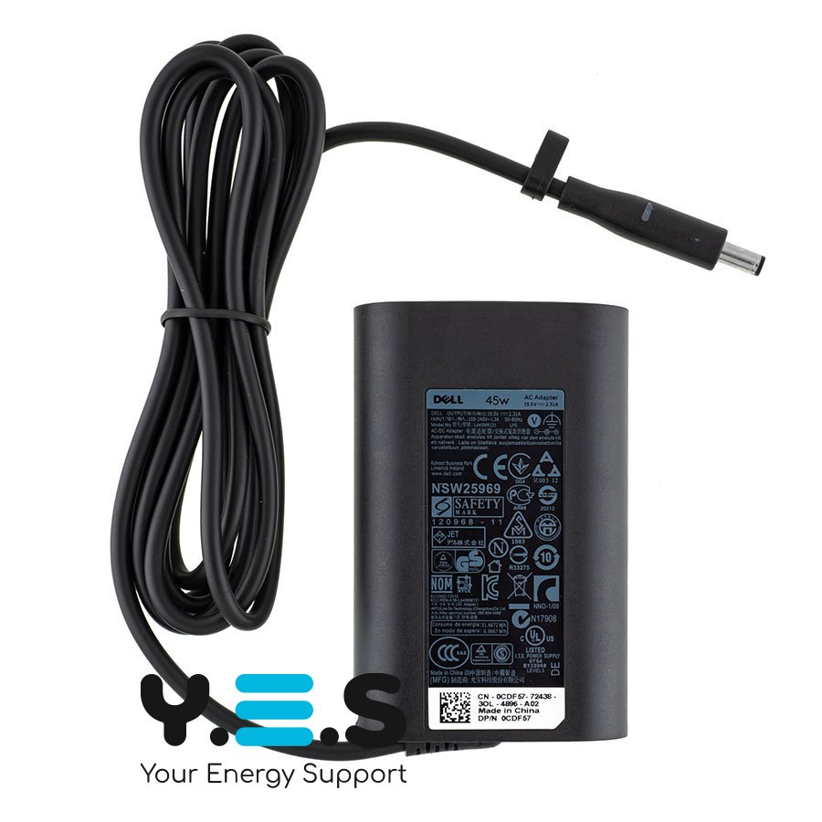 Оригінальний блок живлення Dell потужністю 45W, з тонким роз'ємом 4.5×3.0мм з центральним піном. Підходить для легких та ультратонких ноутбуків Dell серій Inspiron, Latitude, Vostro, XPS з малим енергоспоживанням. Форма корпусу — овальна (OVALE), колір — чорний.