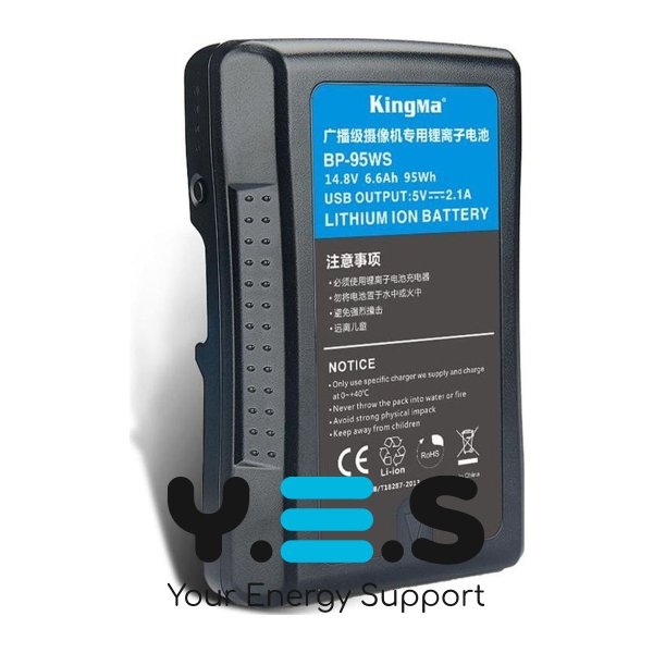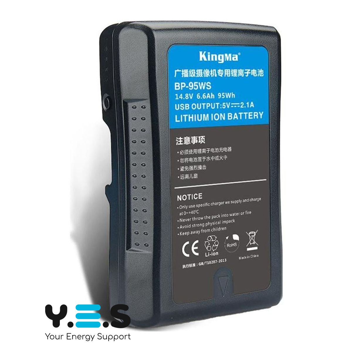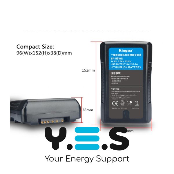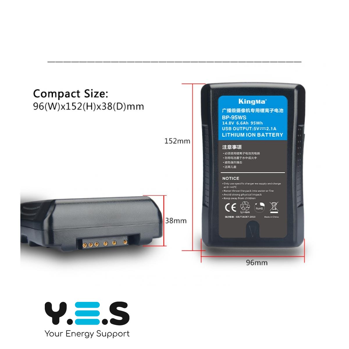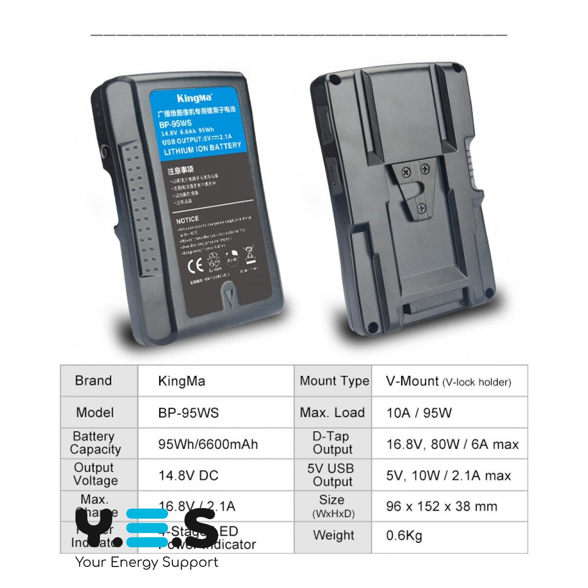 Акумуляторна батарея KingMa V Mount / V-Lock - 95 Wh 14.8V 6600 mAh - призначена для професійних камер та обладнання, що використовують IDX V-Mount (V-Lock) систему: Sony, Red, Canon, Arri, Blackmagic, Panasonic, JVC та інші. Акумулятор обладнаний USB та D-Tap портами, що дозволяє використовувати батарею як зовнішнє джерело живлення для пристроїв різного типу.