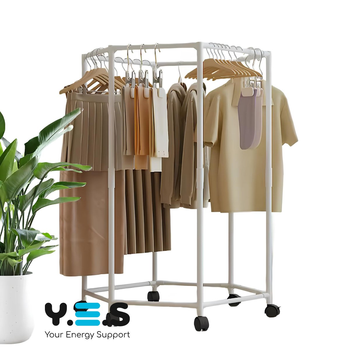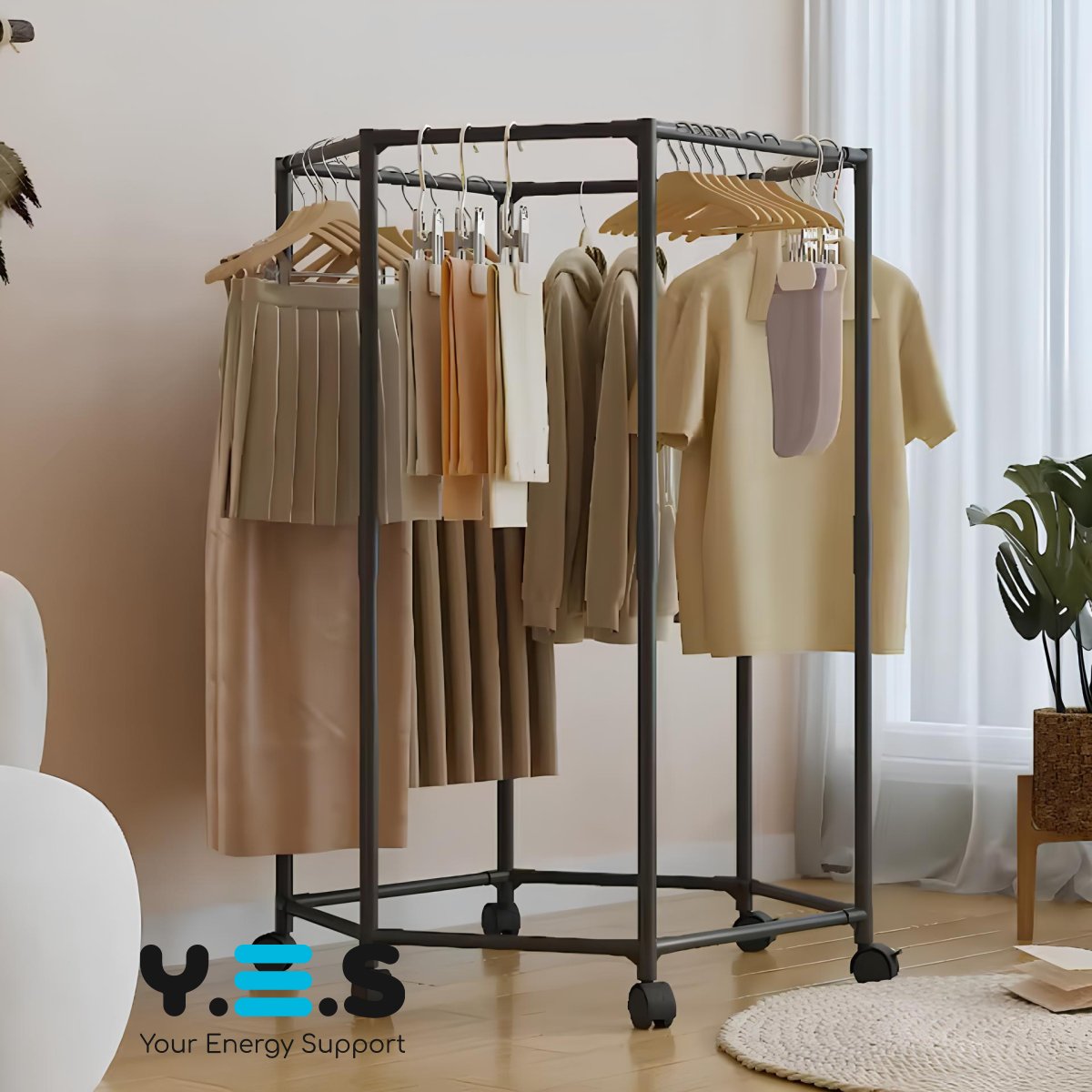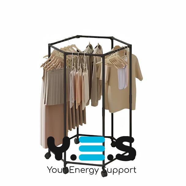Вішалка для одягу з поворотом на 360° — практичне рішення для спальні та гардеробної. Шестикутна конструкція, що обертається, забезпечує зручний доступ до речей з будь-якого боку, а коліщатка дозволяють легко переміщувати вішалку по кімнаті. Підійде для щоденного використання як надійний і зручний органайзер для одягу.