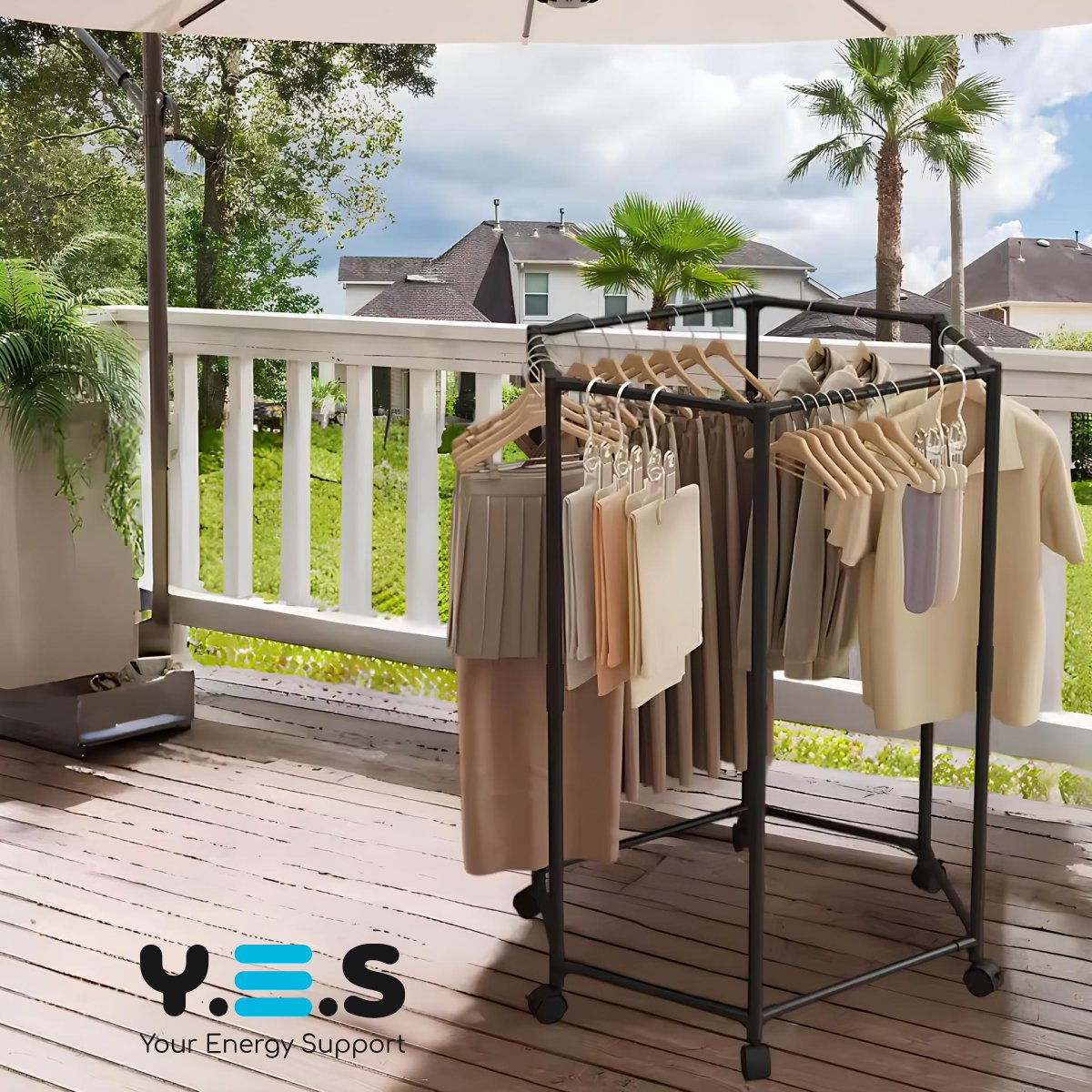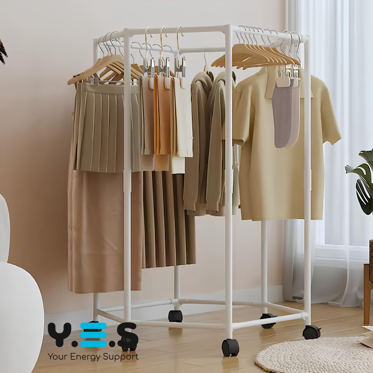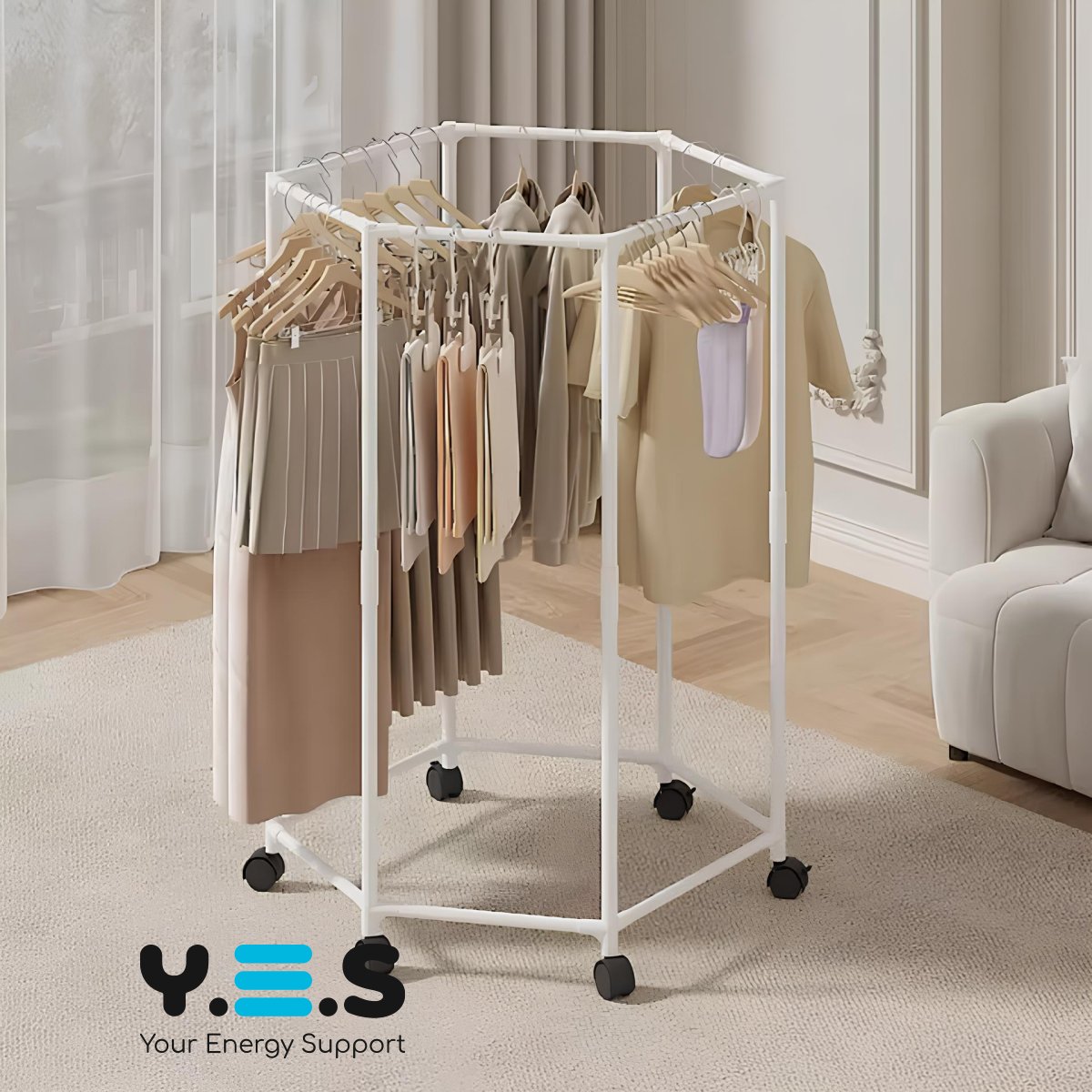 Вішалка для одягу з поворотом на 360° — практичне рішення для спальні та гардеробної. Шестикутна конструкція, що обертається, забезпечує зручний доступ до речей з будь-якого боку, а коліщатка дозволяють легко переміщувати вішалку по кімнаті. Підійде для щоденного використання як надійний і зручний органайзер для одягу.