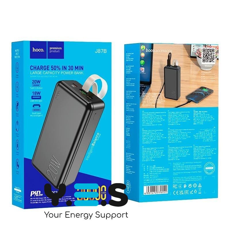 HOCO Tacker J87B - чудове рішення для заряджання мобільних пристроїв в умовах відсутності електроживлення або доступу до мережі. 30000 мА-год пауербанк може заряджати два пристрої одночасно і заряджається через кабель Micro-USB або Type-C. Він сумісний зі смартфонами, планшетами, навушниками, ціпками для селфі та багатьма іншими гаджетами.