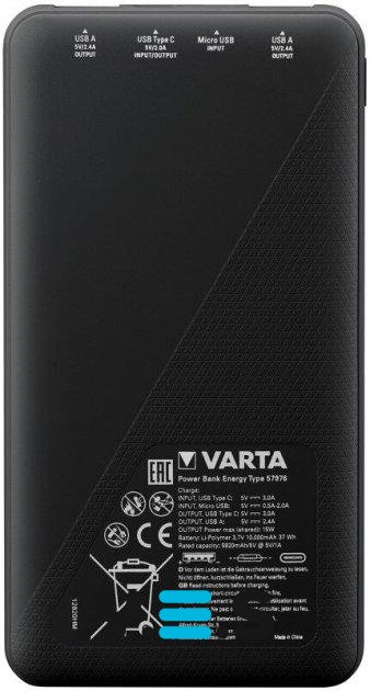 Varta Power Bank Energy Type 57976 4 портами (1x вхід Micro USB, 2x вихід USB A, 1x двонаправлений порт USB Type C)