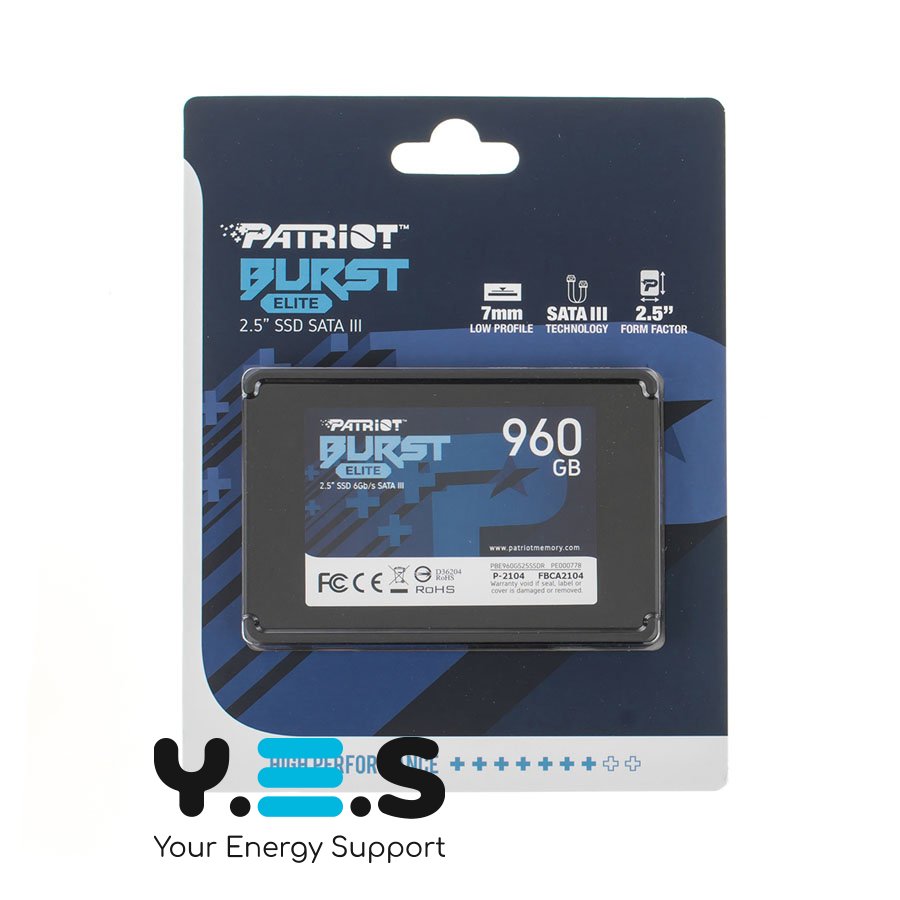SSD Patriot Burst Elite Series 960GB (PBE960GS25SSDR) — твердотільний накопичувач форм-фактора 2.5" для швидкої та стабільної роботи ПК або ноутбука. Завдяки інтерфейсу SATA III та пам’яті 3D QLC забезпечує впевнену продуктивність у повсякденних задачах: завантаження ОС, запуск програм і роботу з файлами. Якісний та надійний варіант для щоденного використання.