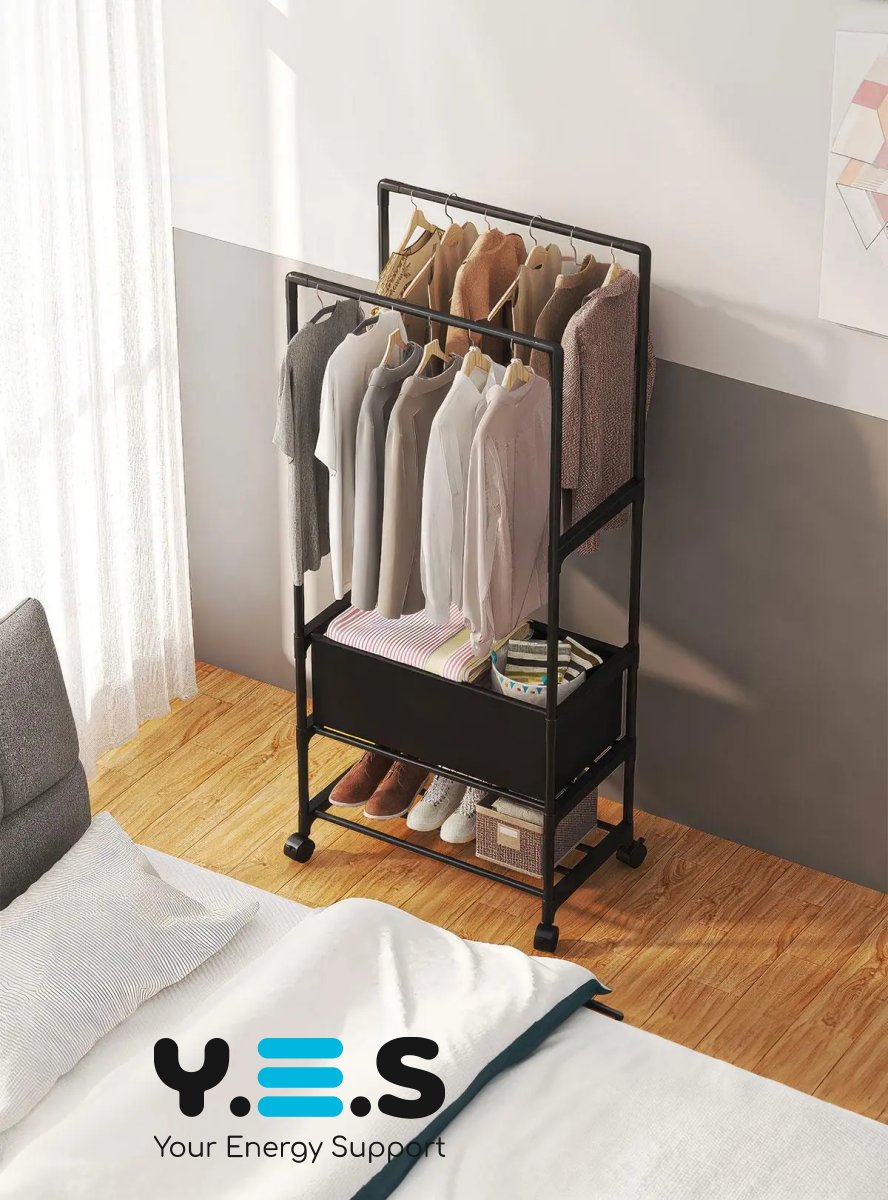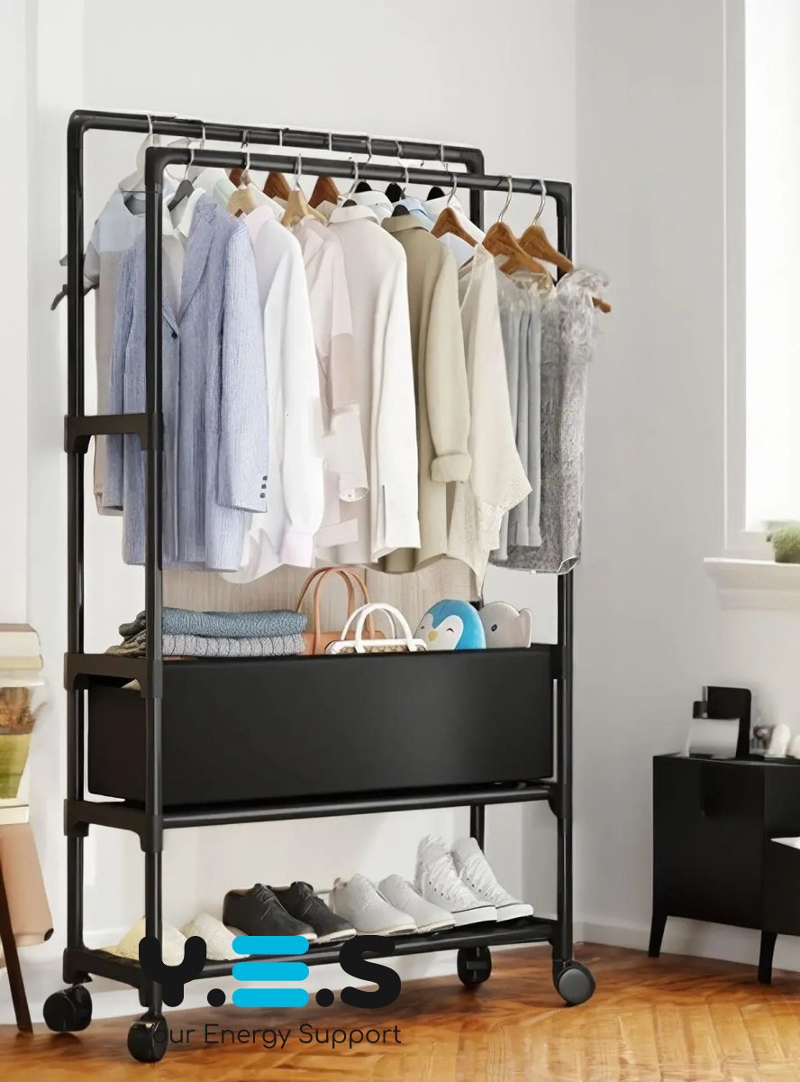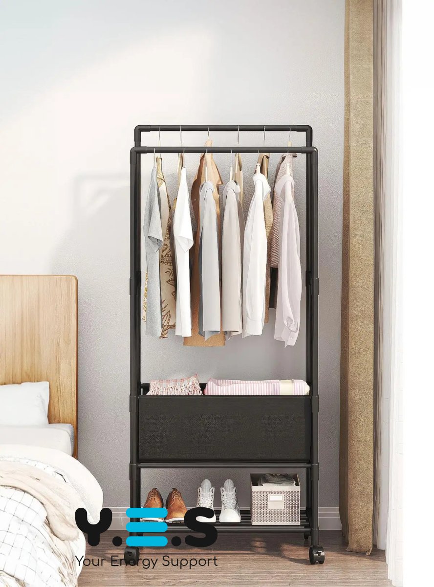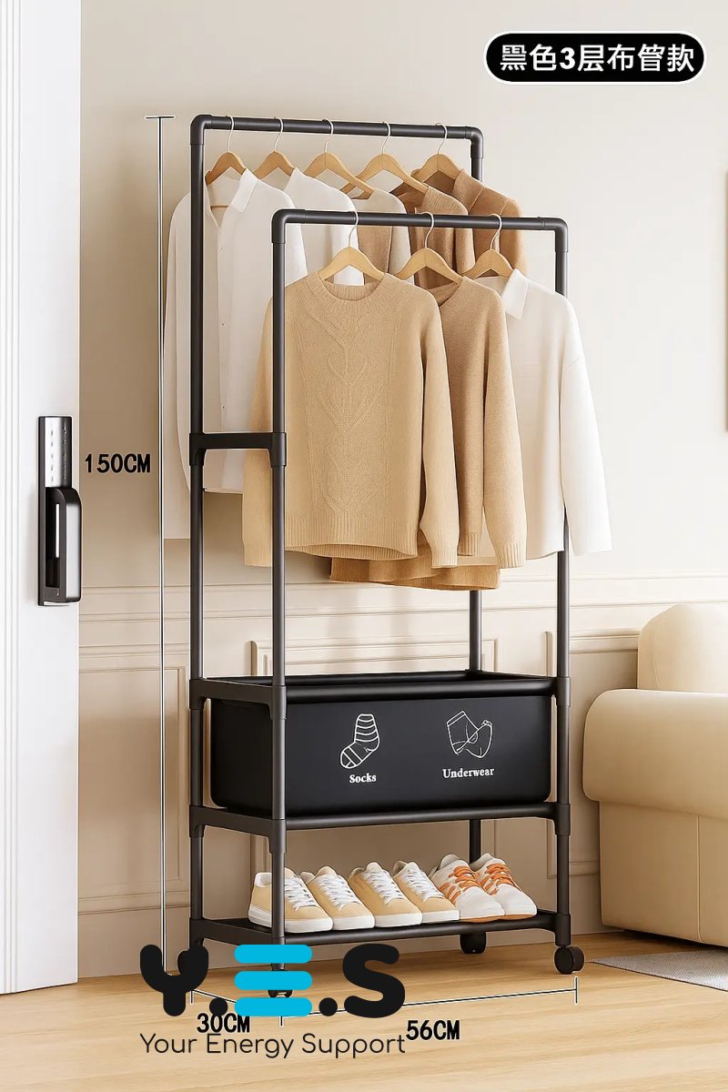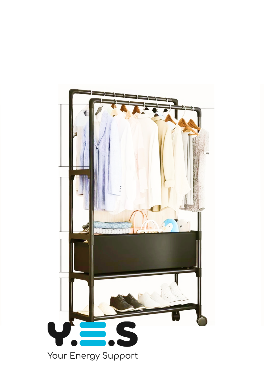 Стійка-Вішалка на колесах для речей та взуття YH9918-3A — практична телескопічна стійка для одягу з регульованою висотою. Завдяки мобільній конструкції на колесах її зручно переміщати по кімнаті, а наявність місця для взуття допомагає підтримувати порядок у щоденному користуванні. Підійде для дому, гардеробної, офісу або шоуруму. Якісний та надійний варіант для щоденного використання.