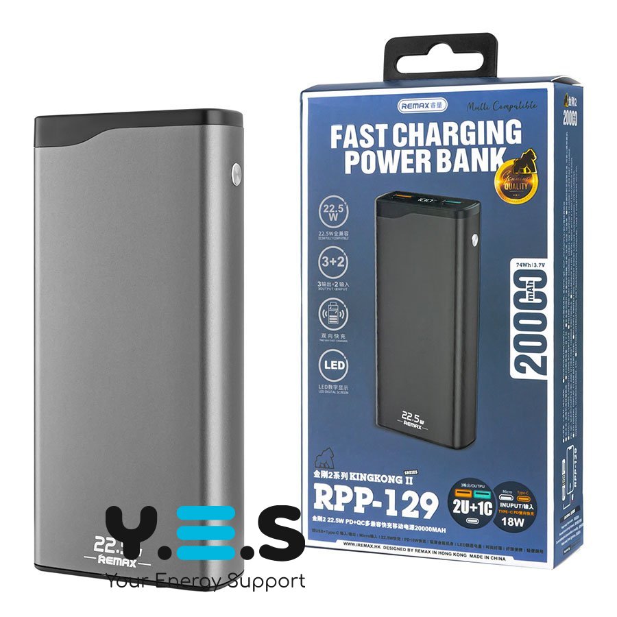 Универсальная мобильная батарея Remax RPP-129 Kingkong II QC 22.5W + PD 18W, 20000mAh, Grey