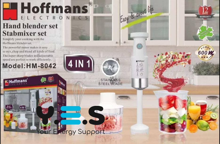 Занурювальний блендер Hoffmans HM-8042 4-в-1 600W — практичний і надійний помічник для щоденного використання на кухні. Підійде для приготування пюре, соусів, крем-супів, а також для збивання та подрібнення інгредієнтів. Завдяки формату 4-в-1 ви отримуєте універсальний набір насадок для різних задач.