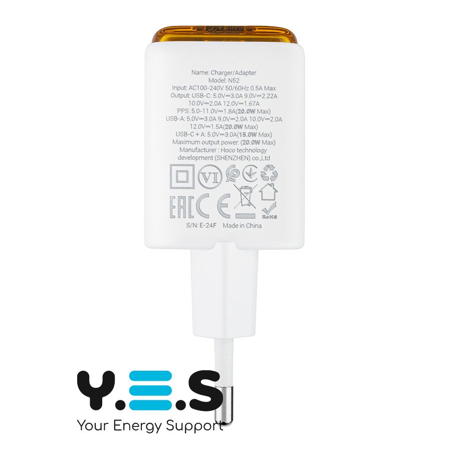 Зарядний пристрій HOCO N52 Monsoon PD20W+QC3.0, White (6942007630375) — компактний мережевий адаптер для швидкої та стабільної зарядки смартфонів, планшетів та інших сумісних гаджетів. Підтримує сучасні протоколи швидкої зарядки, підходить для щоденного використання, відрізняється якісним виконанням і надійною роботою.