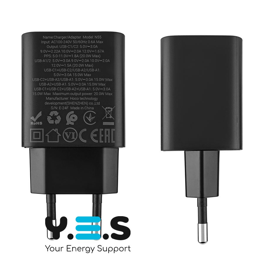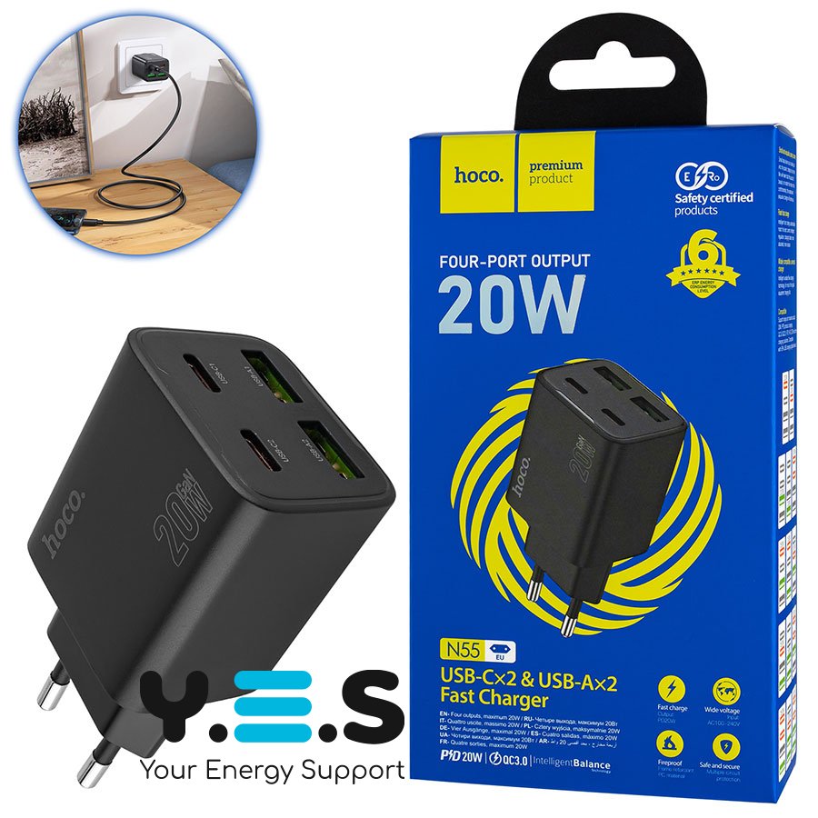 Зарядний пристрій HOCO N55 Fundador (2C+2U) PD20W, Black — якісний та надійний мережевий адаптер для щоденного використання вдома, в офісі або в подорожах. Підтримка Power Delivery до 20W забезпечує швидке та стабільне заряджання сумісних пристроїв, а наявність кількох портів дозволяє підключати кілька гаджетів одночасно.