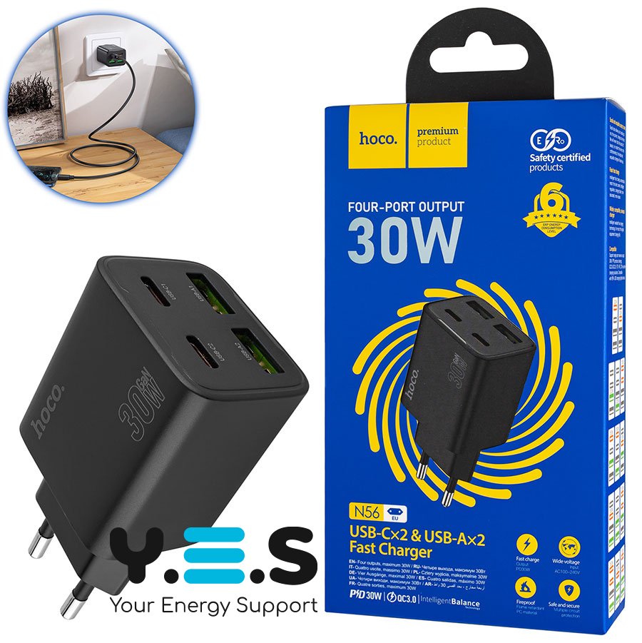 Зарядний пристрій HOCO N56 Fundador 2C+2U PD 30W, чорний (6942007632492)