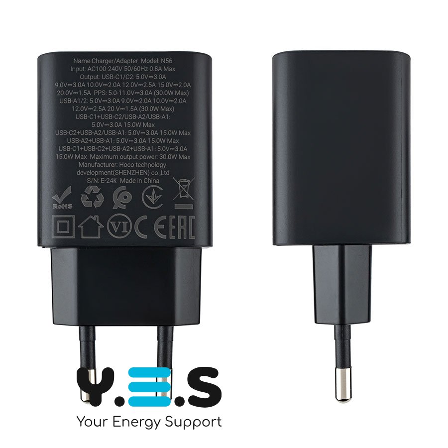 Зарядний пристрій HOCO N56 Fundador (2C+2U) PD30W, Black — якісний і надійний мережевий зарядний пристрій для щоденного використання вдома, в офісі або в подорожах. Модель оснащена кількома портами, що дозволяє заряджати одразу декілька пристроїв, а підтримка Power Delivery забезпечує швидку та стабільну зарядку сумісних гаджетів.