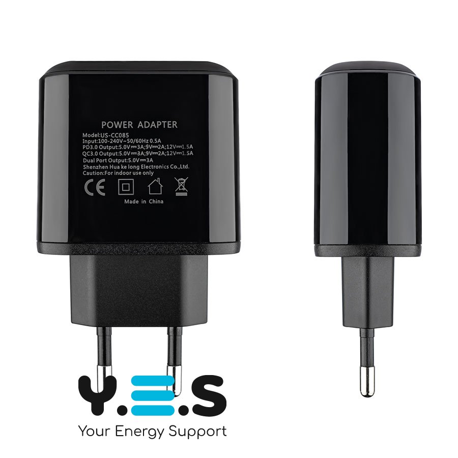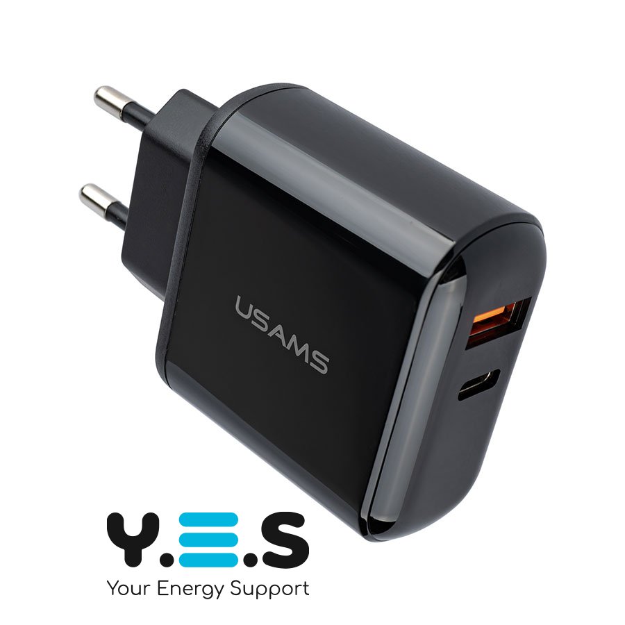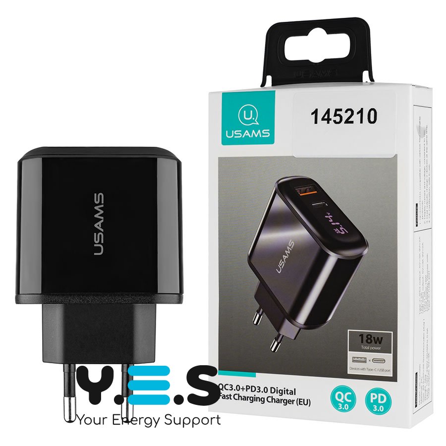Usams US-CC085 (T23) — компактний та надійний зарядний пристрій для щоденного використання. Підтримує сучасні стандарти швидкої зарядки QC3.0 та PD3.0, а також має цифровий дисплей для зручного контролю процесу заряджання. Виконаний у стильному чорному кольорі.