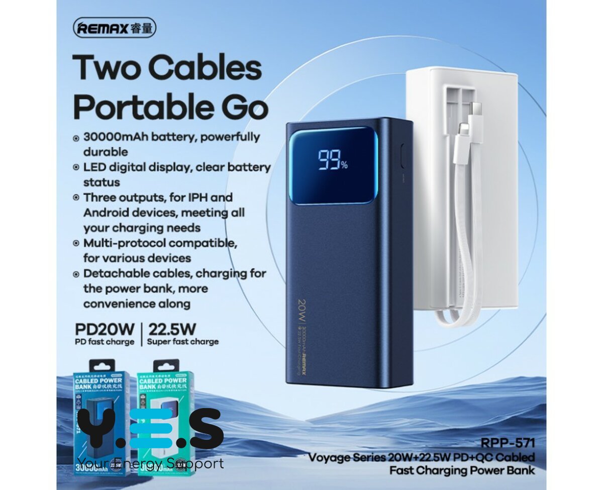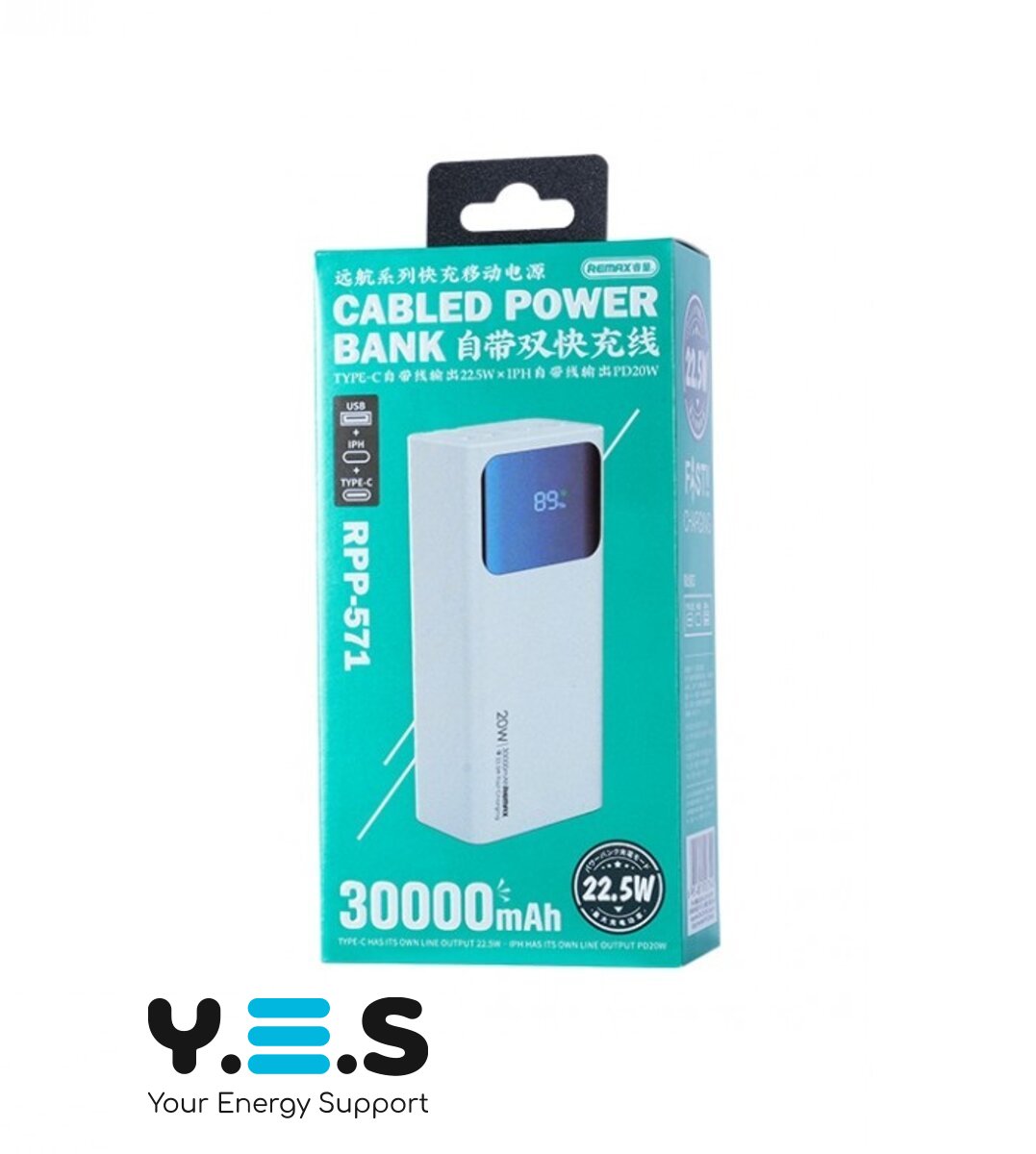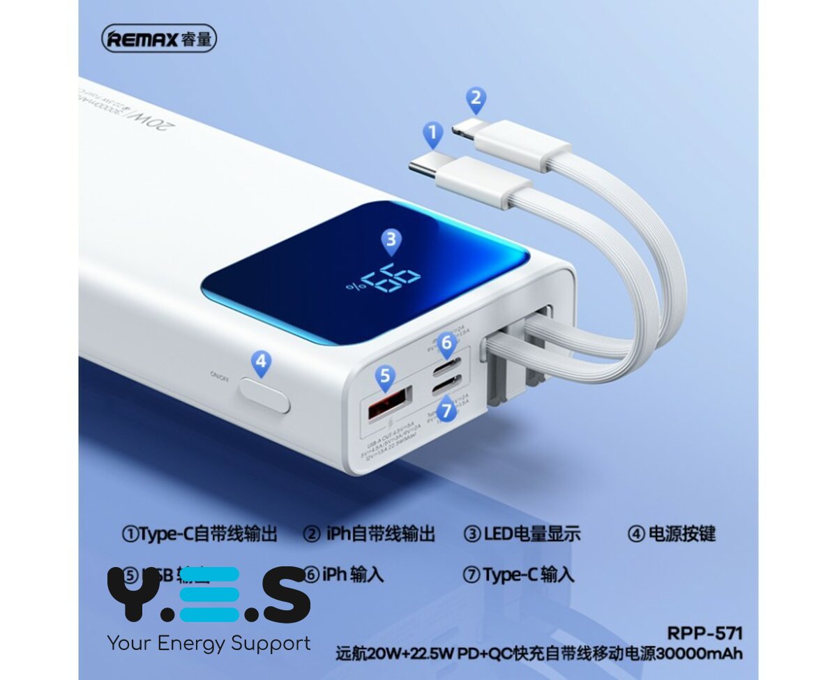 Зовнішній білий акумулятор 30000mAh REMAX RPP-571 Voyage Series PD20W+QC22.5W Cabled Fast Charging Power Bank